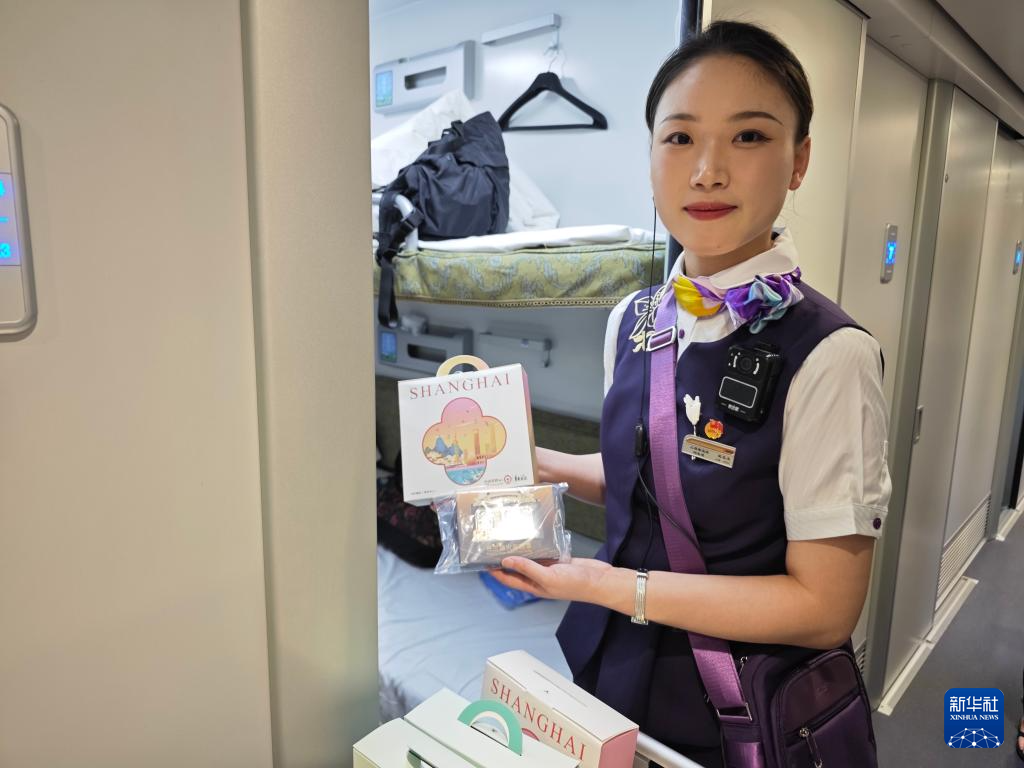 6月15日,乘务员在香港西九龙至上海虹桥D908次高铁动卧列车上展示为首班车旅客准备的纪念品。新华社记者 褚萌萌 摄