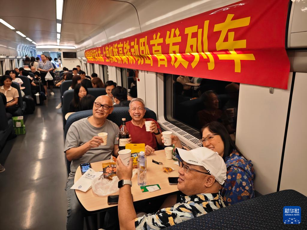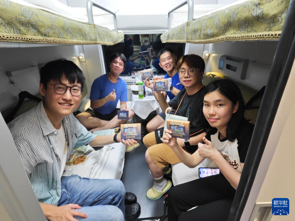6月15日,铁路上海虹桥站工作人员向乘坐上海虹桥至香港西九龙D907次高铁动卧列车的旅客发放纪念品。新华社记者 王翔 摄pagebreak