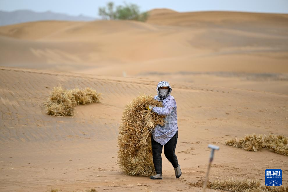 治沙工人在宁夏中卫市境内的腾格里沙漠搬运刷状网绳式草方格沙障(5月30日摄)。