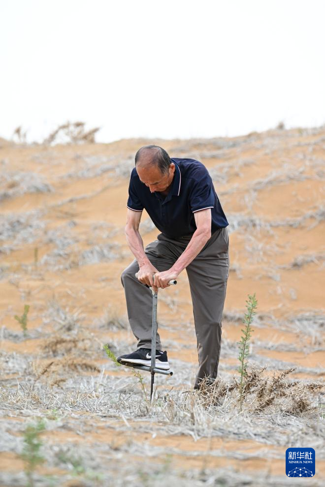 固定住沙面,阻止沙子流动后,接下来就在草方格里播下草籽、栽种苗木。凭借多年的一线治沙经验,中卫市国有林场总场工程师唐希明发明了“干”字形植苗器,将造林成活率提高了25%,劳动成本降低了50%。唐希明的“土发明”获得专利,有了专业名称“水分传导式精准型沙漠植苗工具”,不仅在当地大面积推广使用,如今还被推广到甘肃、新疆等地。