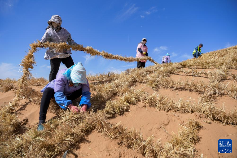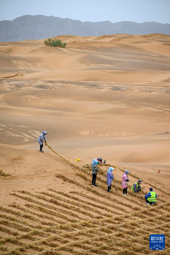 治沙工人在宁夏中卫市境内的腾格里沙漠铺设刷状网绳式草方格沙障(5月29日摄)。