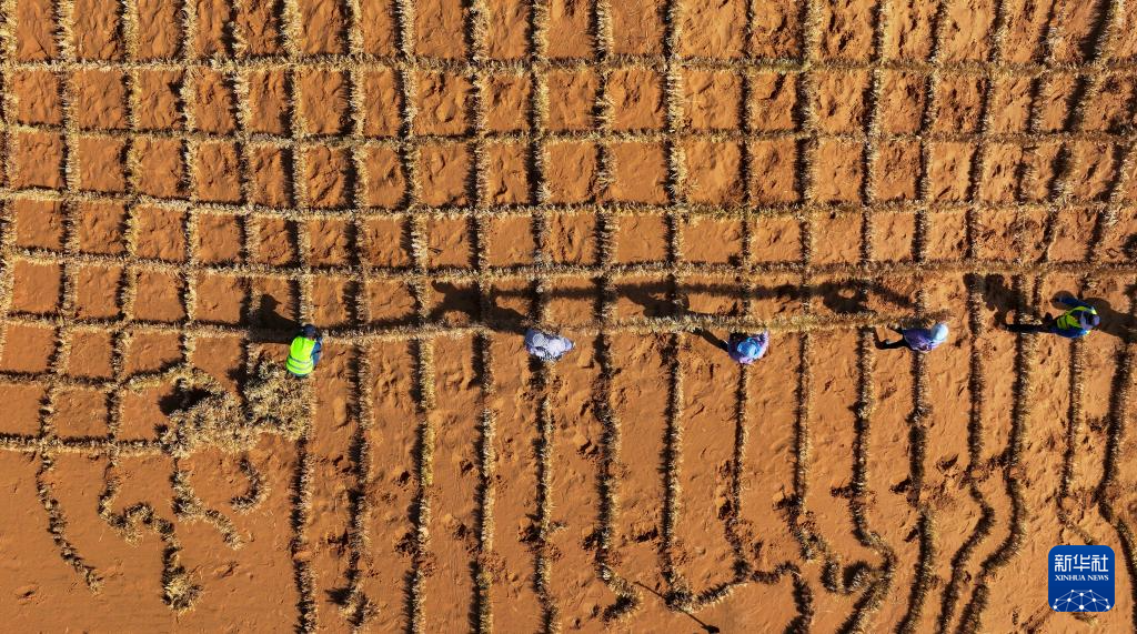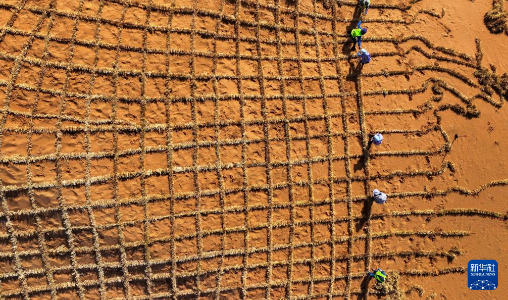 治沙工人在宁夏中卫市境内的腾格里沙漠铺设刷状网绳式草方格沙障(5月30日摄,无人机照片)。