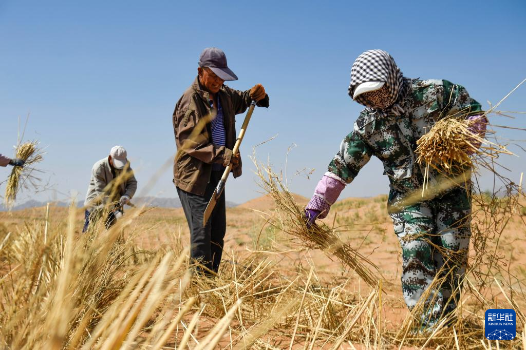 来自肯尼亚的北京大学南南学院在读博士麦克(左一)在腾格里沙漠体验扎草方格(5月31日摄)。