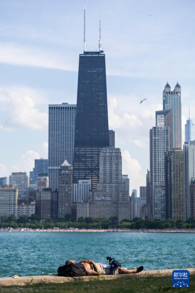 6月17日,美国芝加哥的一名男子躺在防波堤上休息。