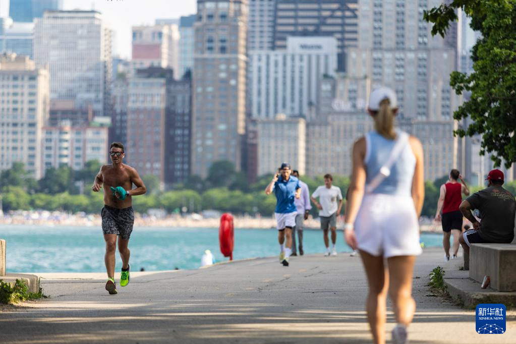 6月17日,人们在美国芝加哥密歇根湖畔慢跑、散步。