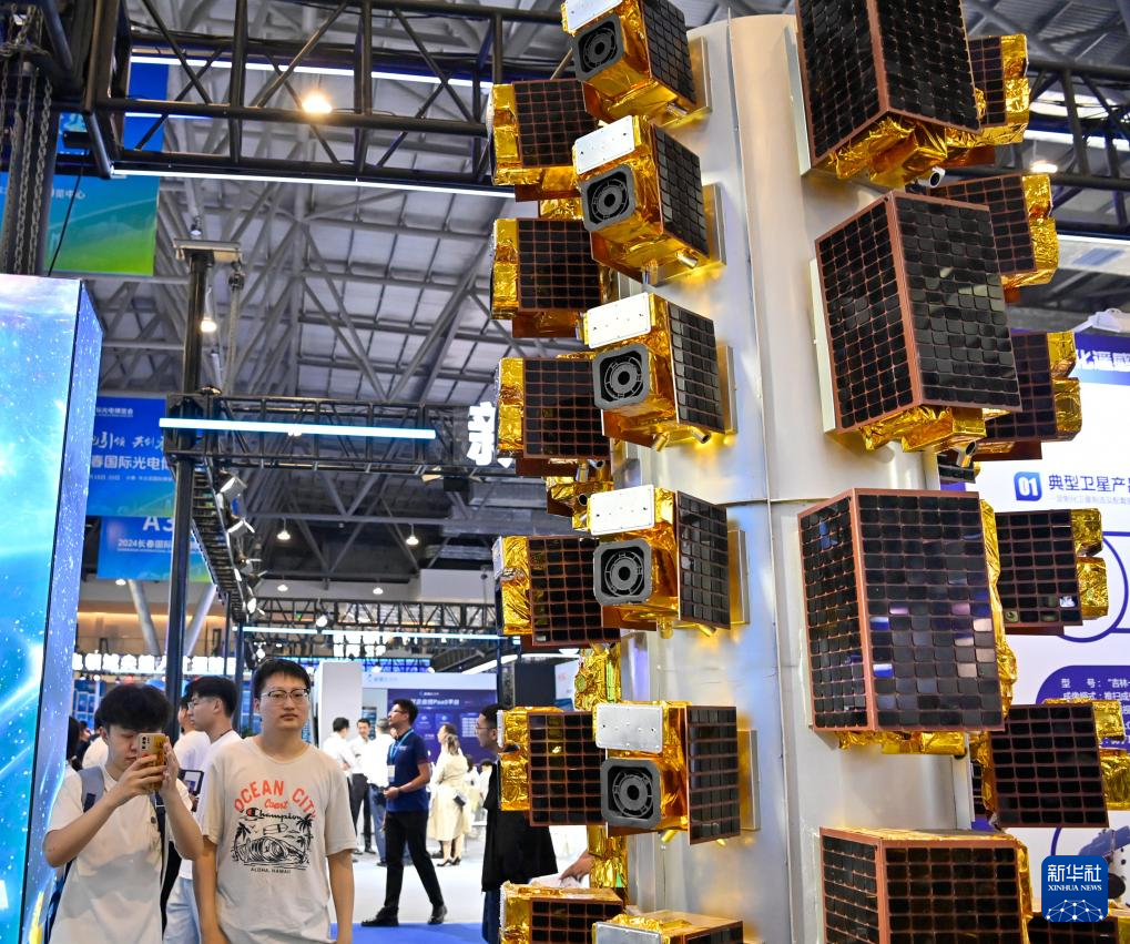 6月18日,观众在2024长春国际光电博览会上参观“一箭41星”星箭对接模型。