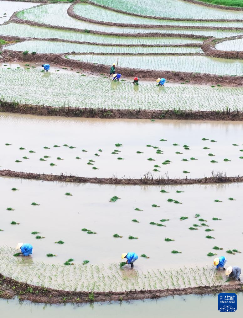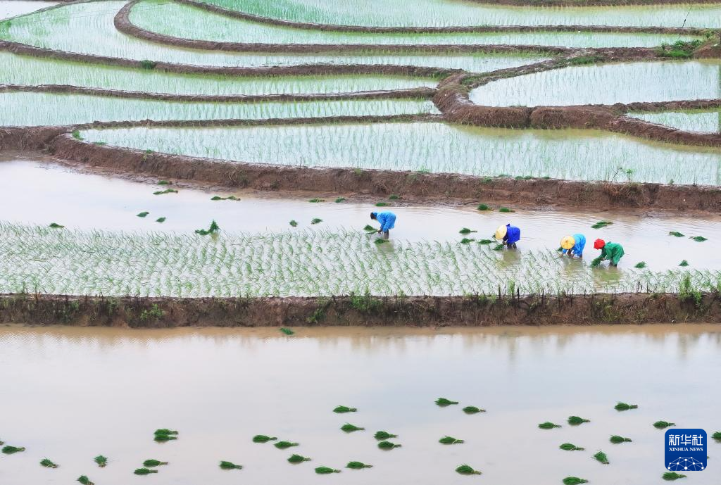 6月19日,在湖南省衡阳市衡东县大浦镇,当地村民在插秧(无人机照片)。