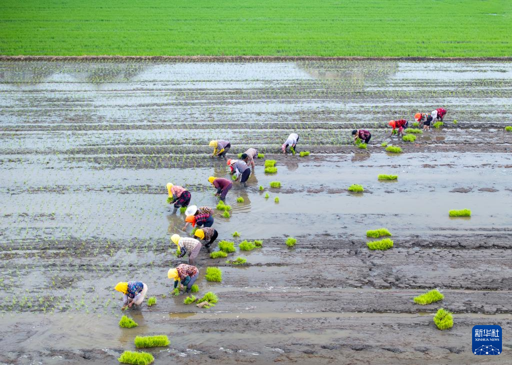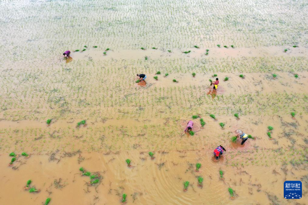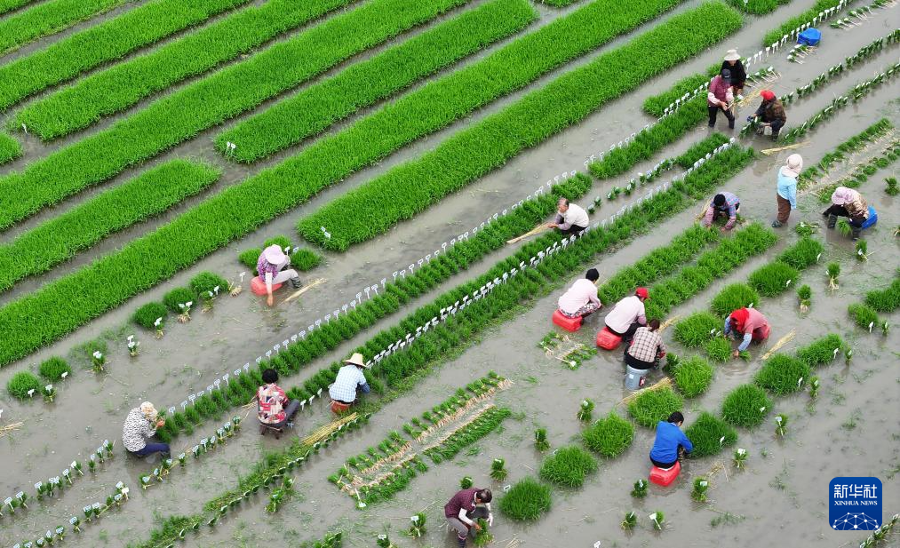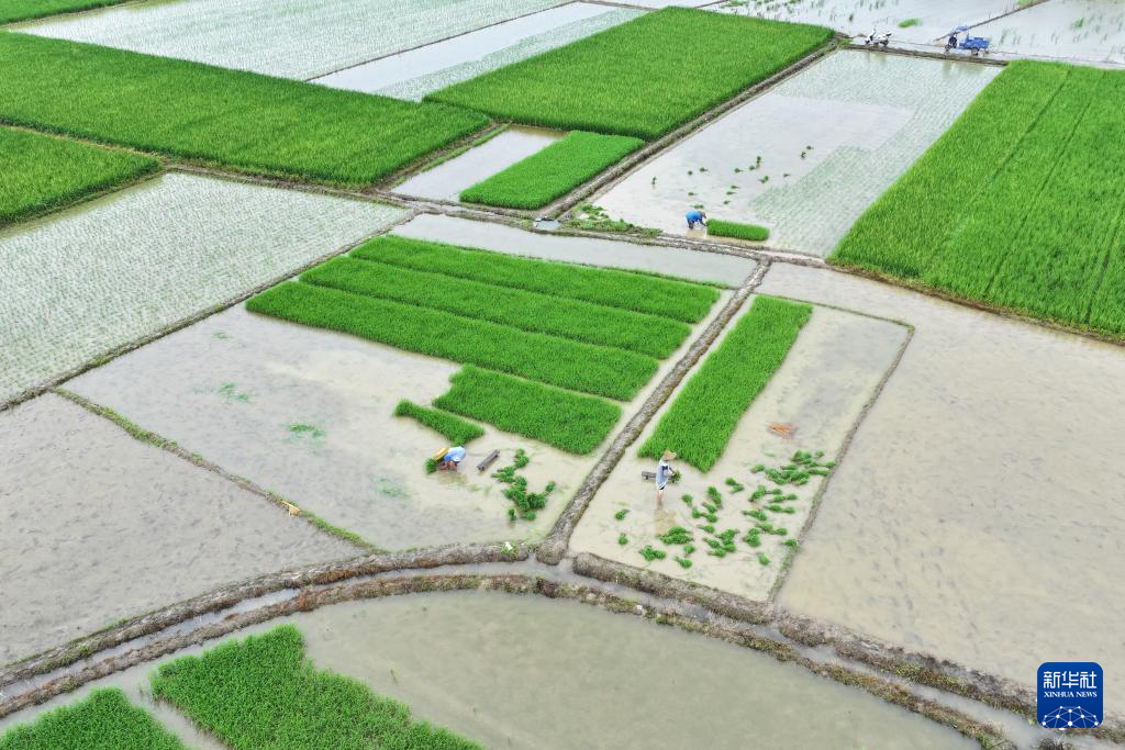 6月19日,湖南省永州市道县万家庄街道五洲社区,村民在起水稻秧苗(无人机照片)。