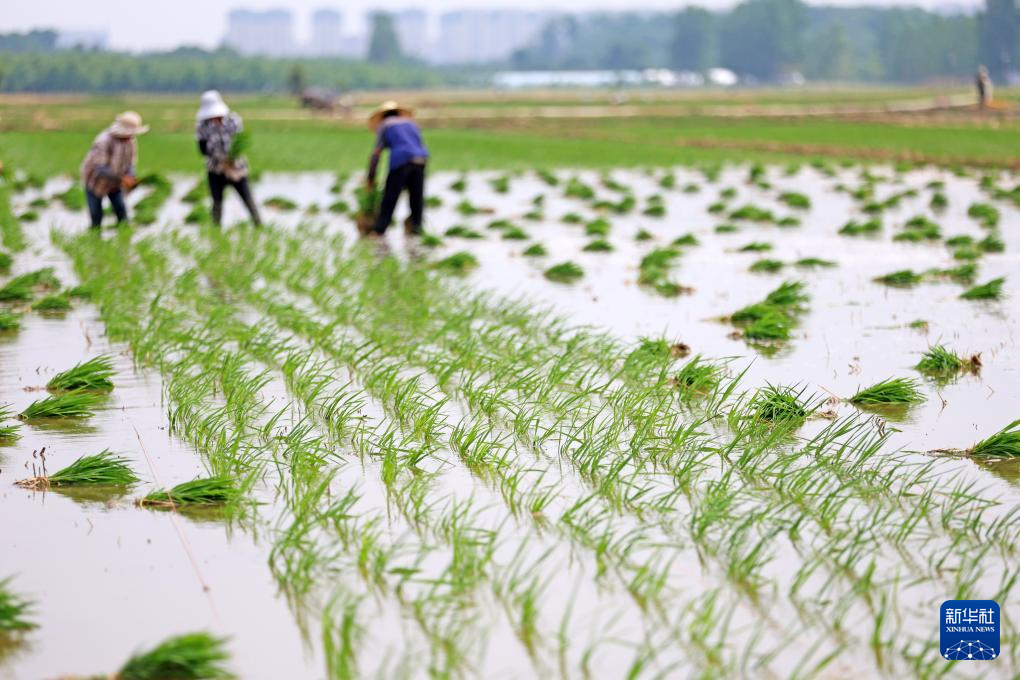 6月19日,山东省临沂市郯城县郯城街道农民进行水稻插秧。