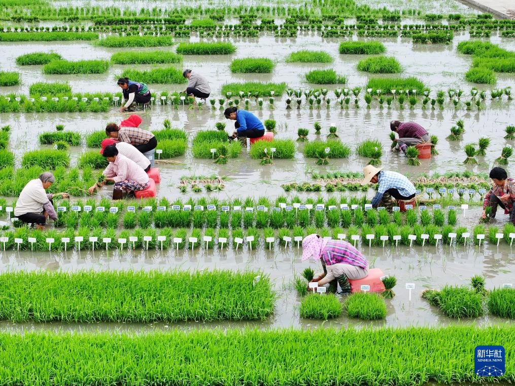 6月19日,在江苏里下河地区农科所(扬州市农科院),农民在田间起水稻秧苗(无人机照片)。