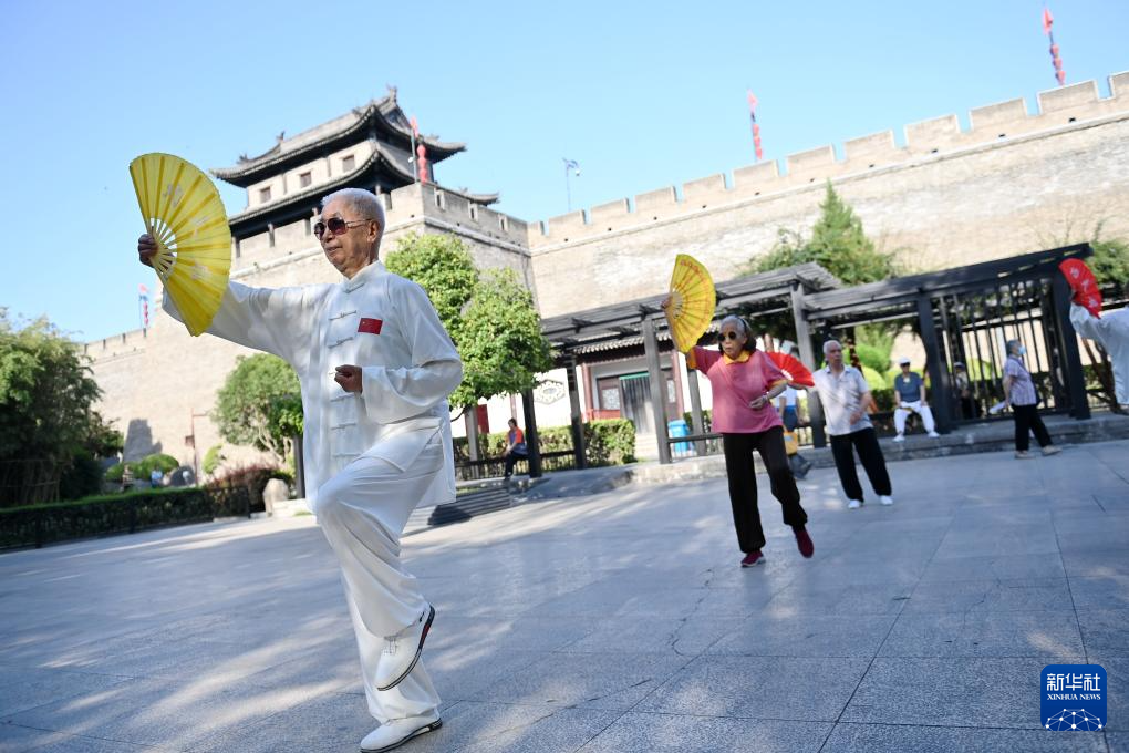6月12日,市民在西安城墙下的环城公园长乐门外打太极扇。
