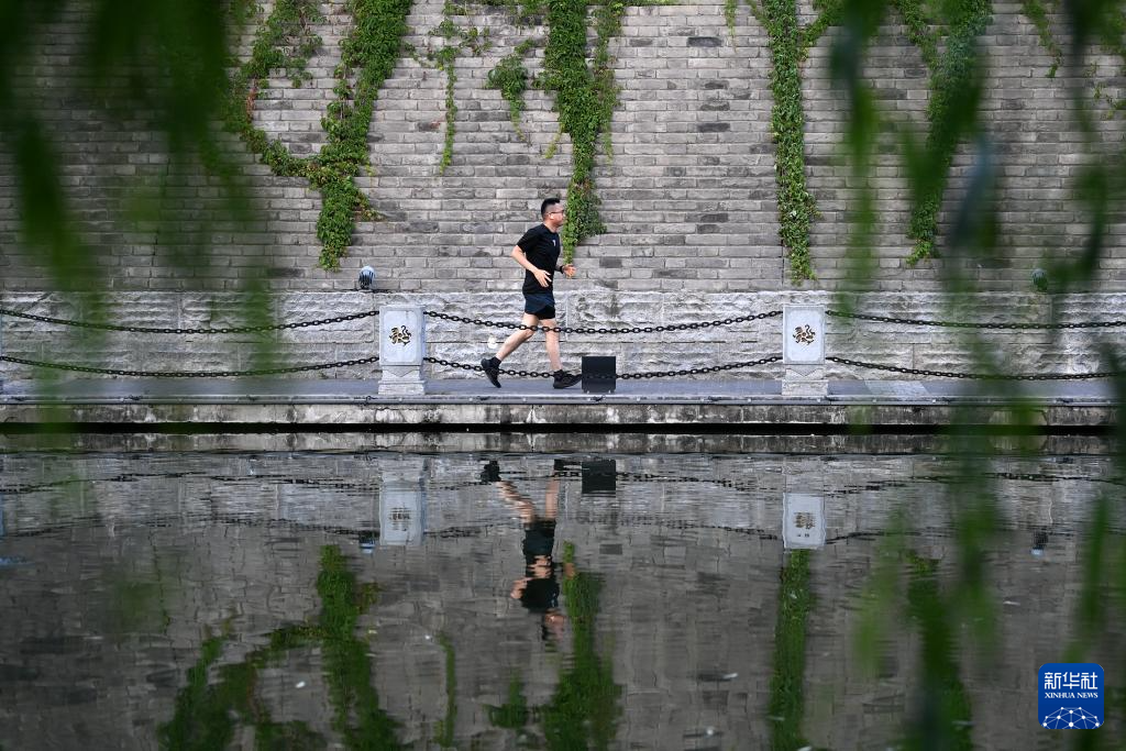 6月17日,市民在城墙下的护城河畔跑步锻炼。