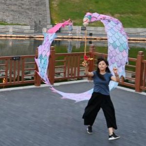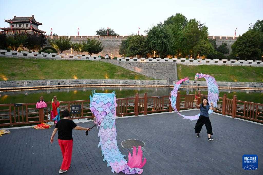 6月17日,市民在西安城墙下的环城西苑舞彩龙。