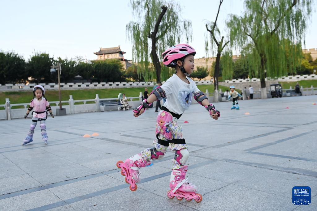 6月17日,小朋友在西安城墙安定门外练习轮滑。