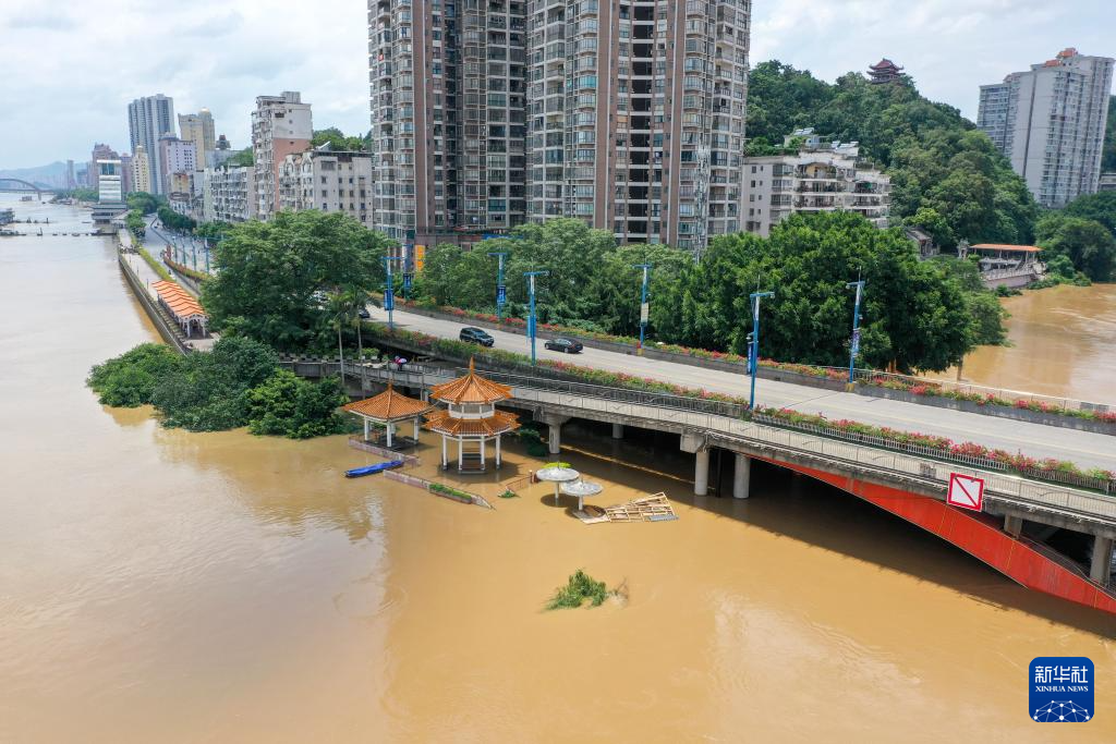 广西梧州市区江边部分低洼地段被洪水淹没(6月21日摄,无人机照片)。