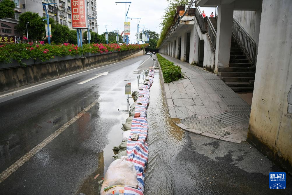 这是6月21日在广西梧州市区拍摄的防洪引水导流沙袋。
