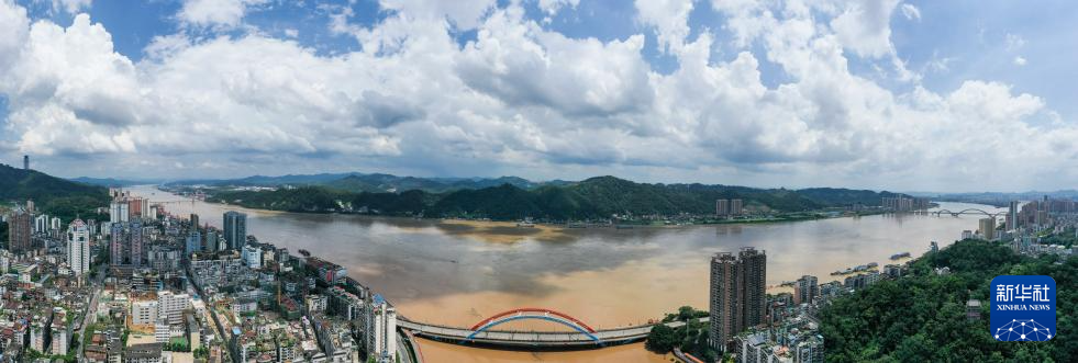 这是6月21日在广西梧州市区拍摄的浔江、桂江、西江“三江”交汇处的江面 (无人机全景照片)。