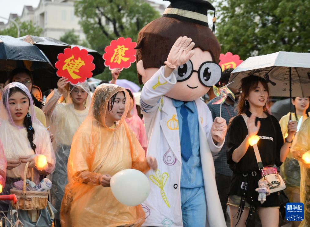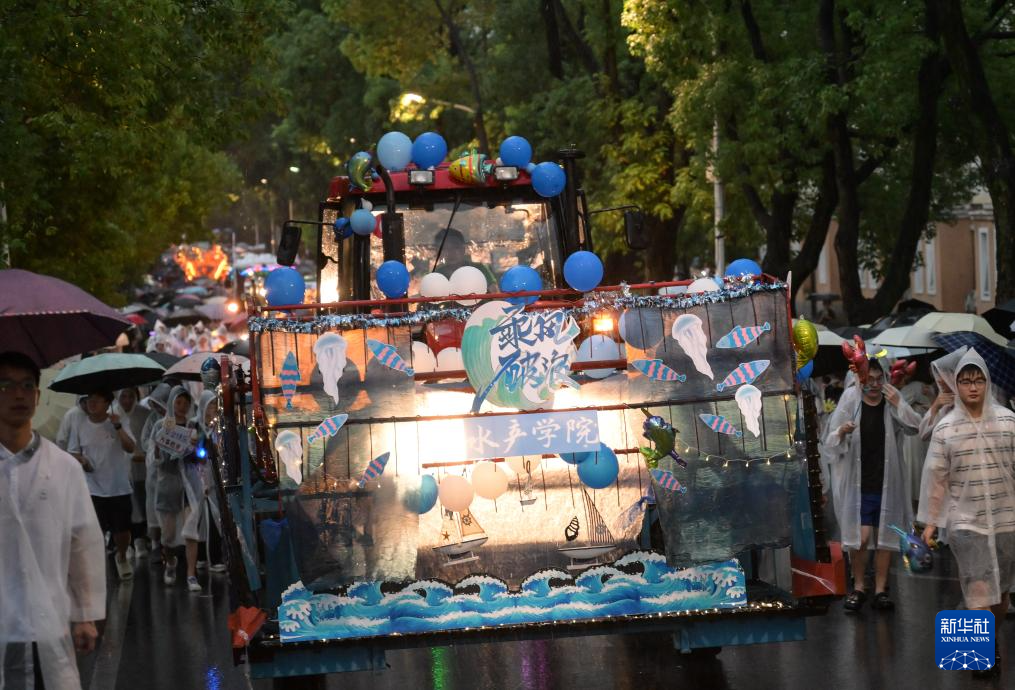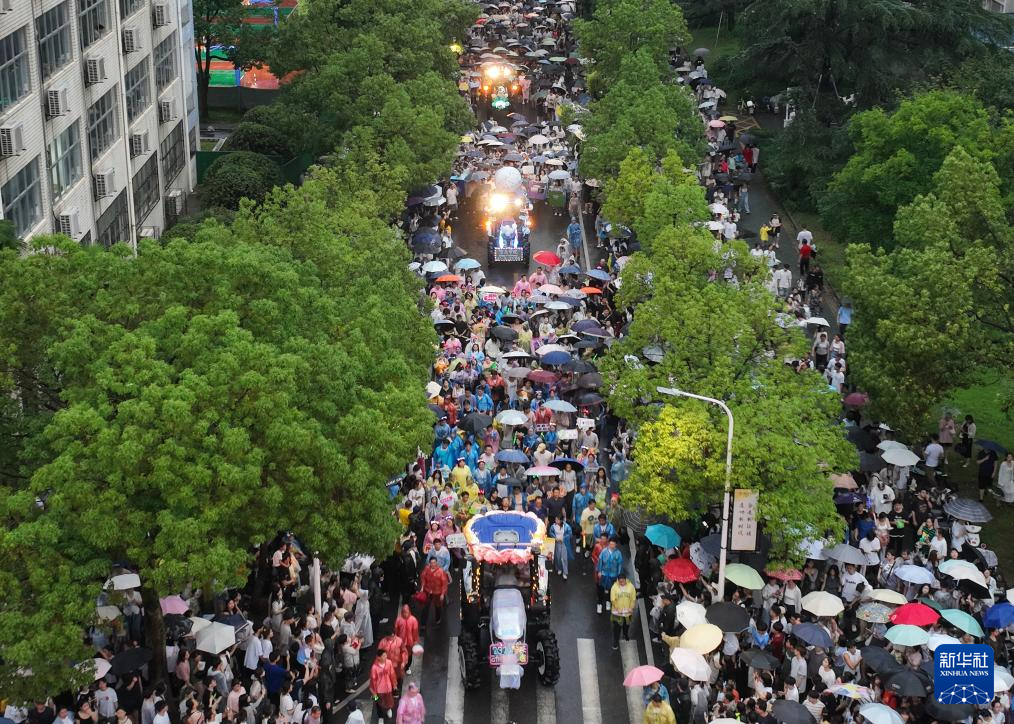 6月21日,华中农业大学学生在校园里冒雨巡游。