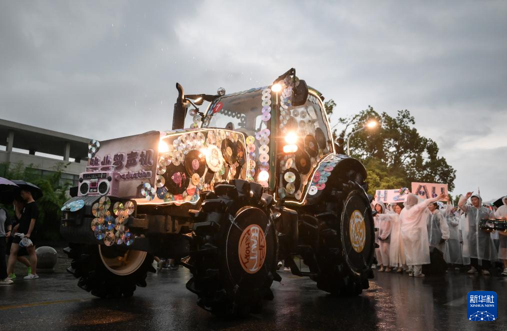 6月21日,农机花车队伍在华中农业大学校园里冒雨巡游。