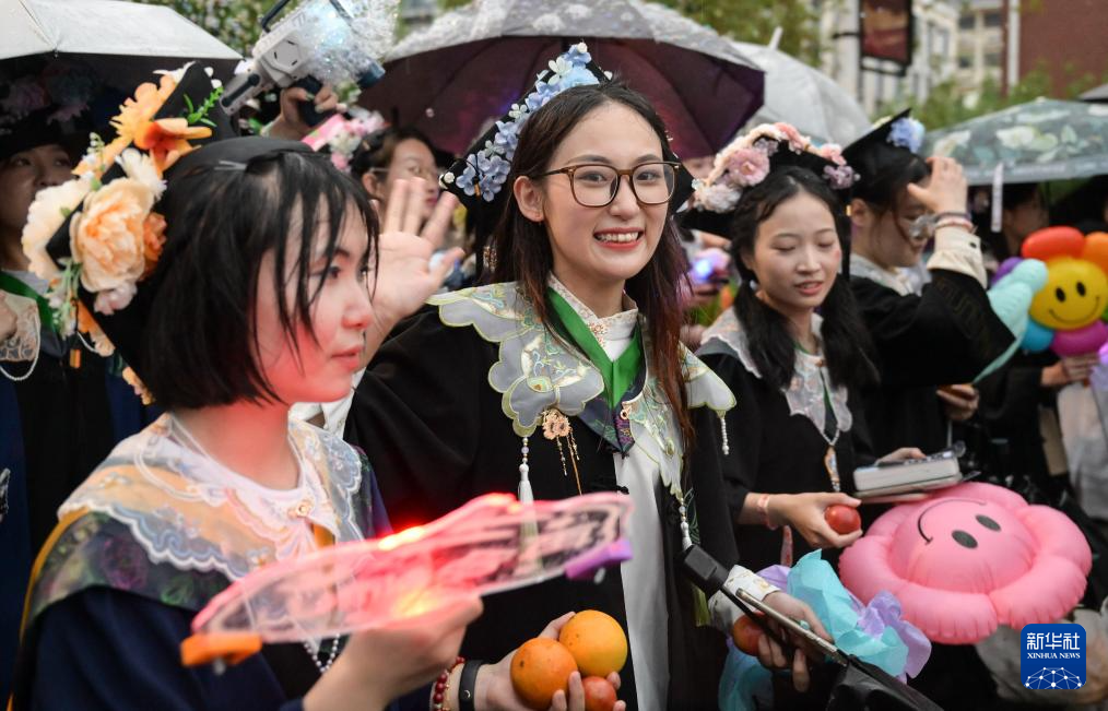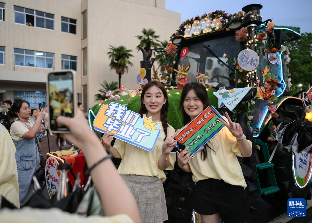 当日,华中农业大学举行一场花车巡游,学生们簇拥着由现代农机装备组成的花车队伍,在校园里巡游,庆祝毕业、致敬青春。