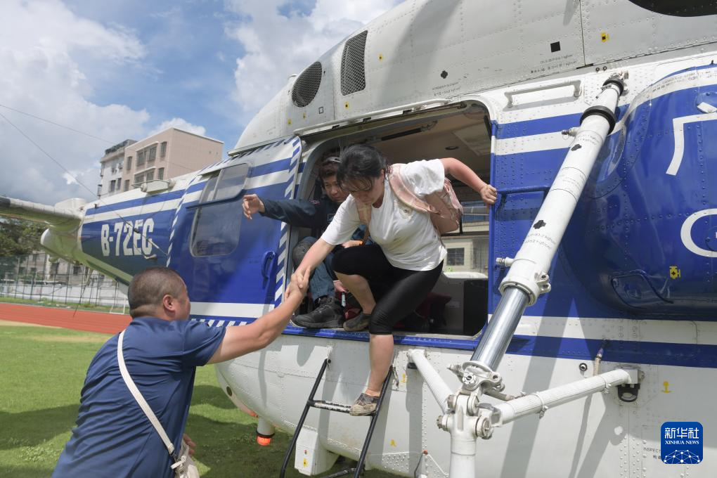救援直升机将广东省梅州市平远县泗水镇大新村的村民转移到县城(6月19日摄)。
