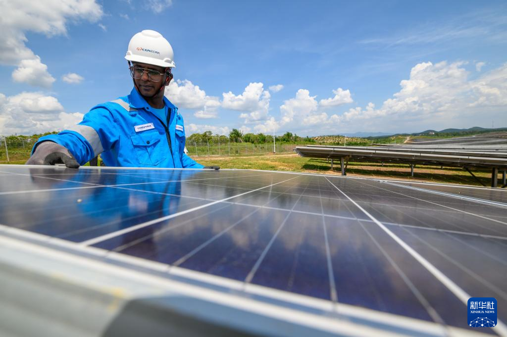 在马来西亚吉打州南部的瓜拉基蒂光伏电站,工人检查设备(6月6日摄)。这座电站由中国广核能源国际控股有限公司所属埃德拉电力控股有限公司运营,由中国能源建设集团天津电力建设有限公司承建,占地260英亩,装机50兆瓦,2019年开始商业运行。