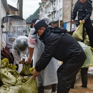 6月24日,抢险人员在安徽省黄山市屯溪区昱东街道水心亭社区放置沙袋。