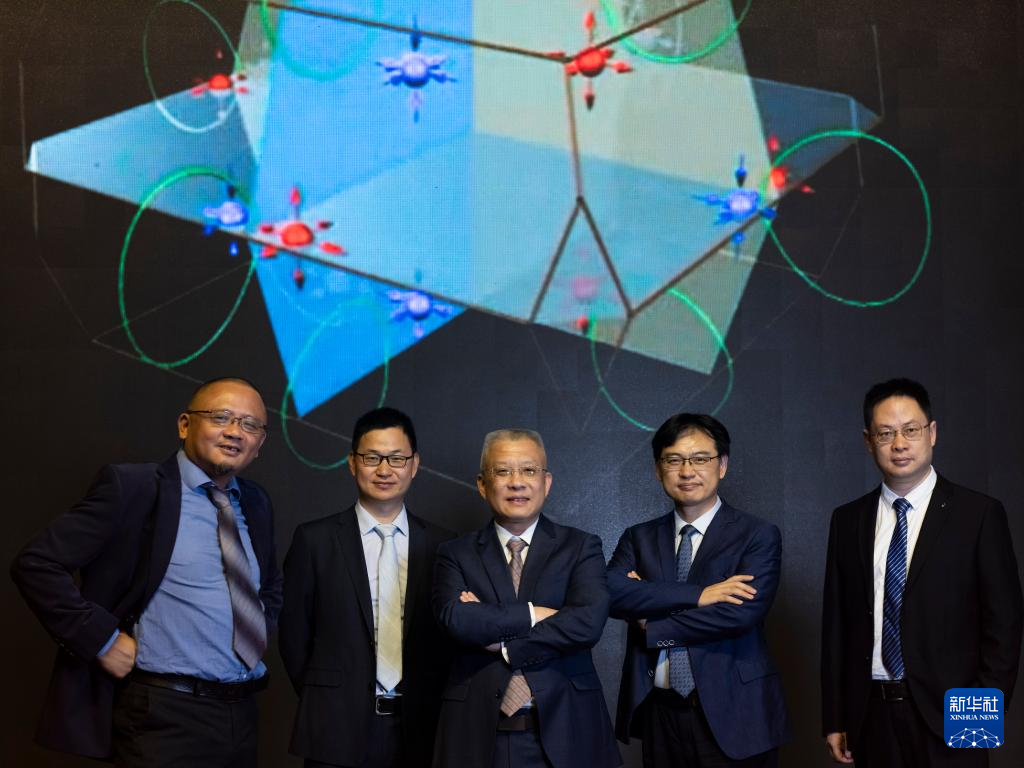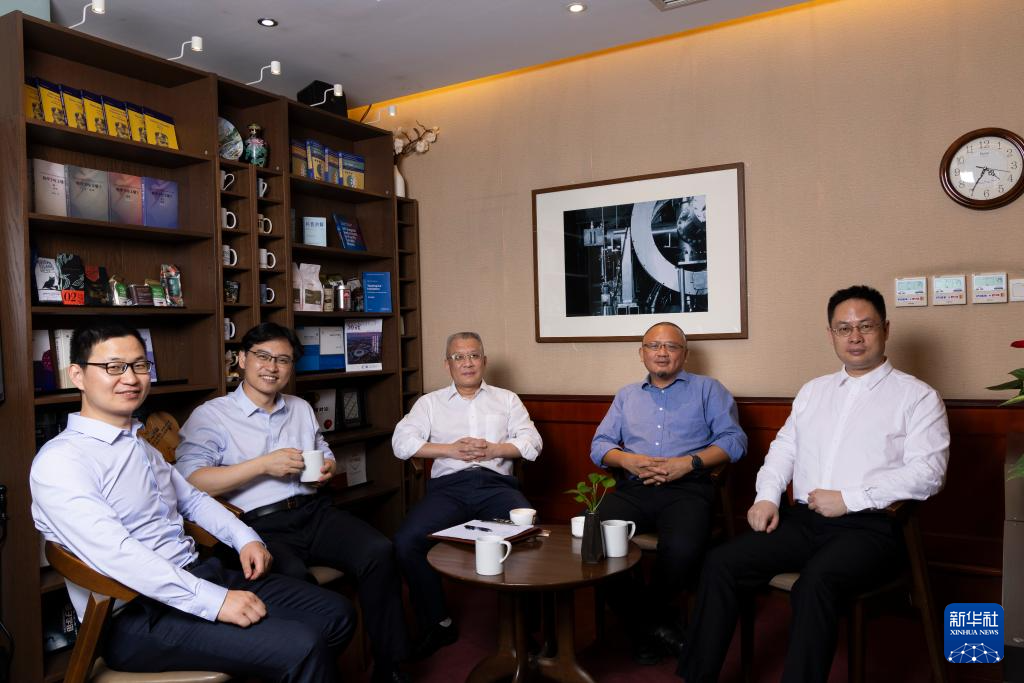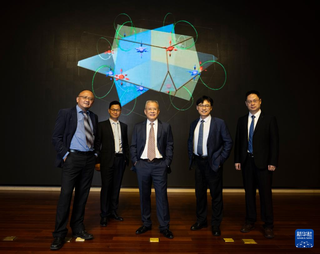 6月22日,在位于北京的中国科学院物理研究所,方忠(中)和团队成员王志俊(左一)、翁红明(左二)、戴希(右二)、余睿(右一)合影。