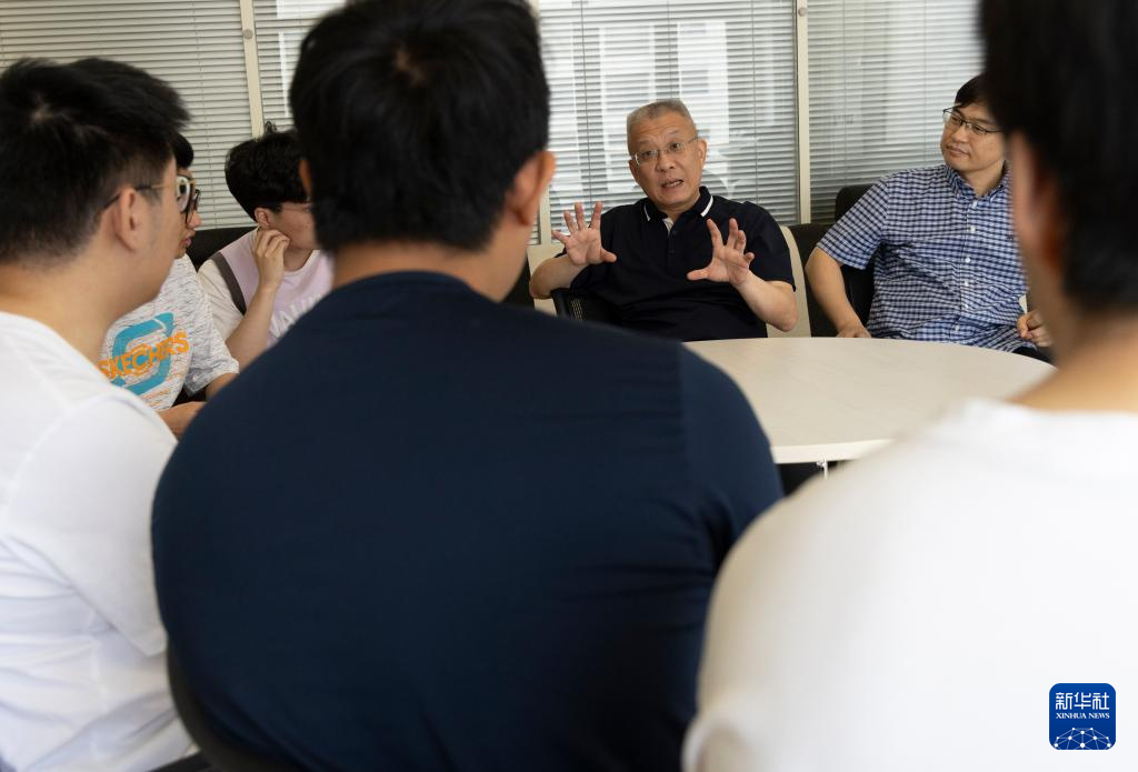 6月19日,在中国科学院物理研究所,方忠(右二)、翁红明和学生们在一起交流。