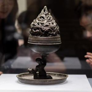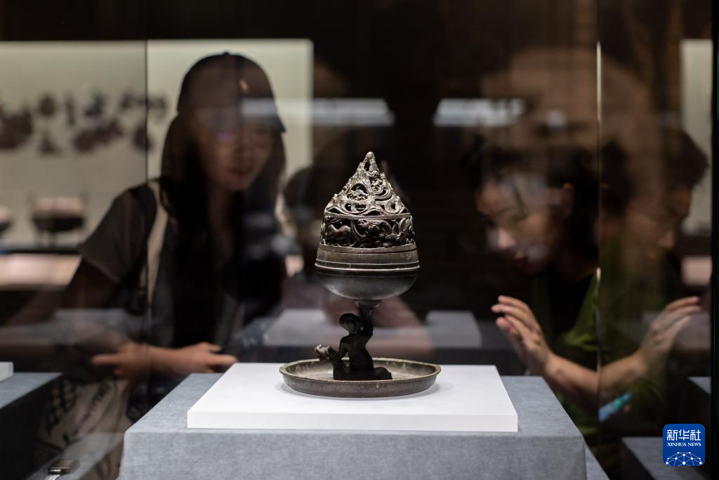 6月25日,观众在“大汉未央——汉代王室精品文物展”上观看骑兽人物博山炉。