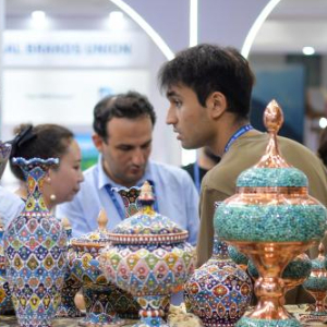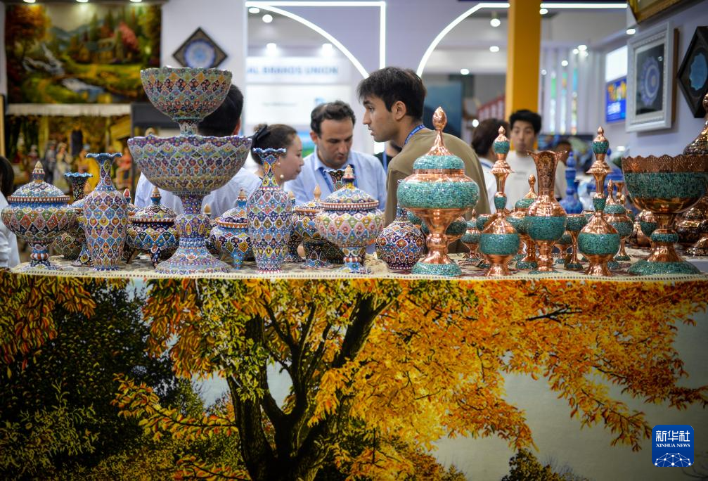 6月26日,在位于乌鲁木齐的新疆国际会展中心,观众在伊朗展台选购商品。