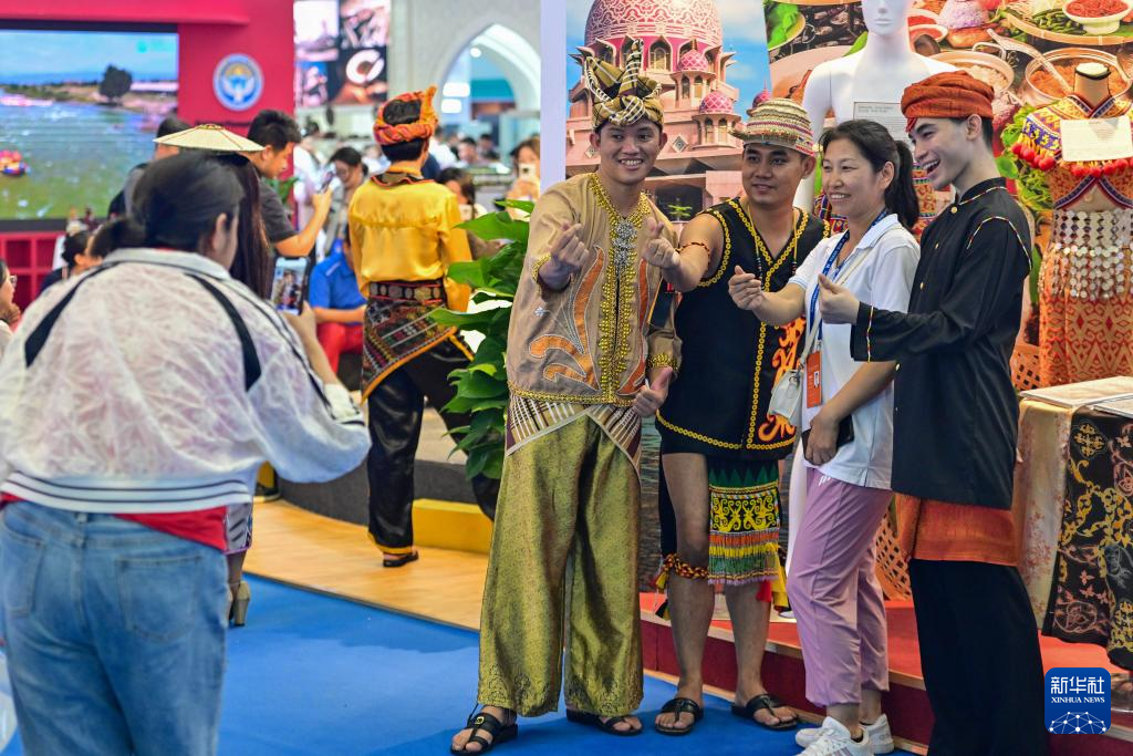 6月26日,在第八届中国—亚欧博览会上,参观者与马来西亚展区工作人员合影留念。