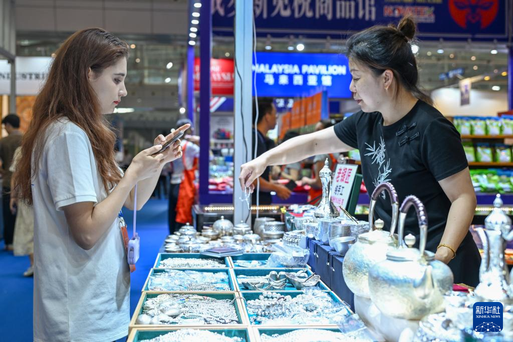6月26日,在第八届中国—亚欧博览会上,参会嘉宾在挑选银饰。