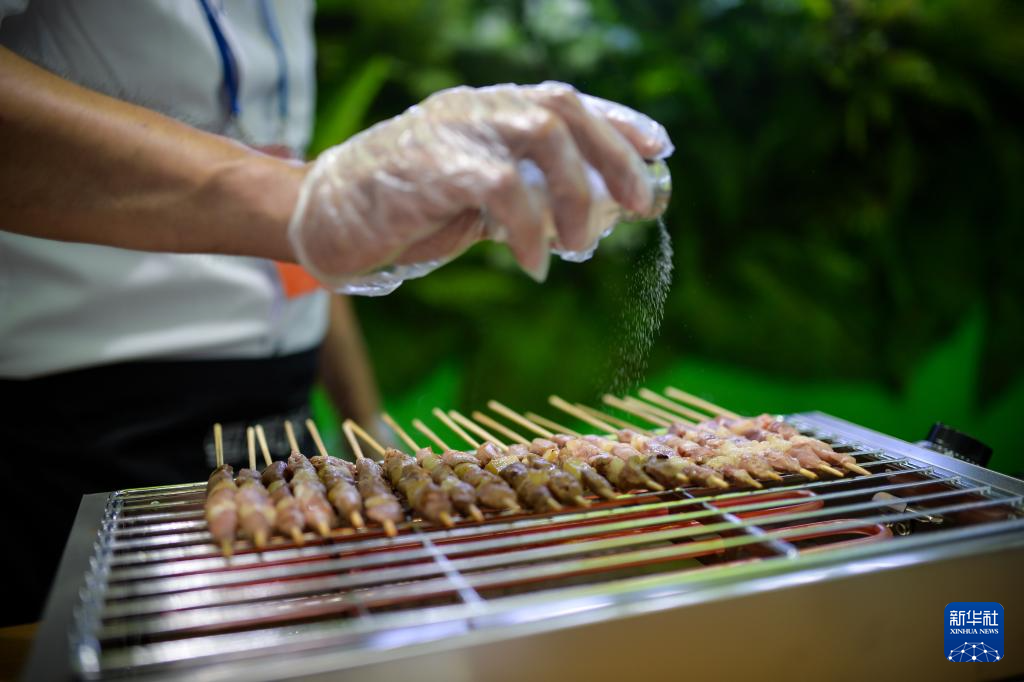 6月26日,在位于乌鲁木齐的新疆国际会展中心,新疆农牧投展台工作人员展示烤羊肉串。