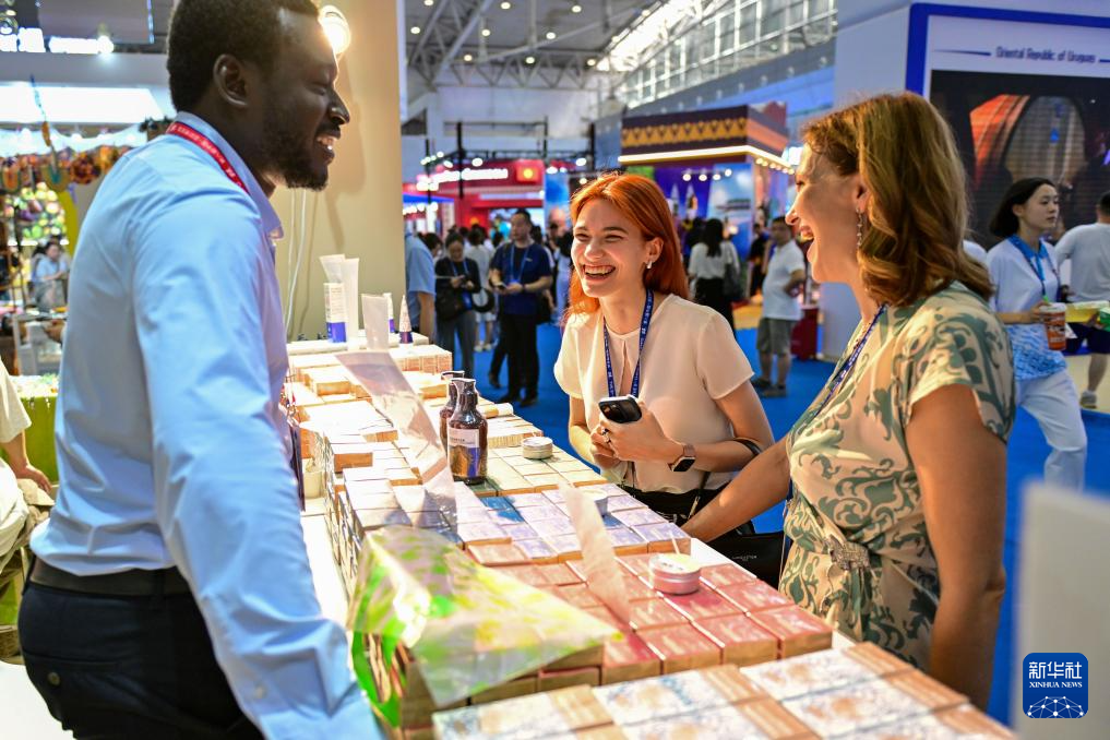 6月26日,在第八届中国—亚欧博览会上,境外采购商在加纳共和国展区与工作人员交流。