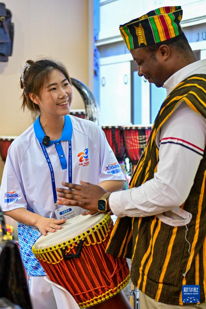 6月26日,在第八届中国—亚欧博览会上,志愿者在加纳共和国展区学打手鼓。
