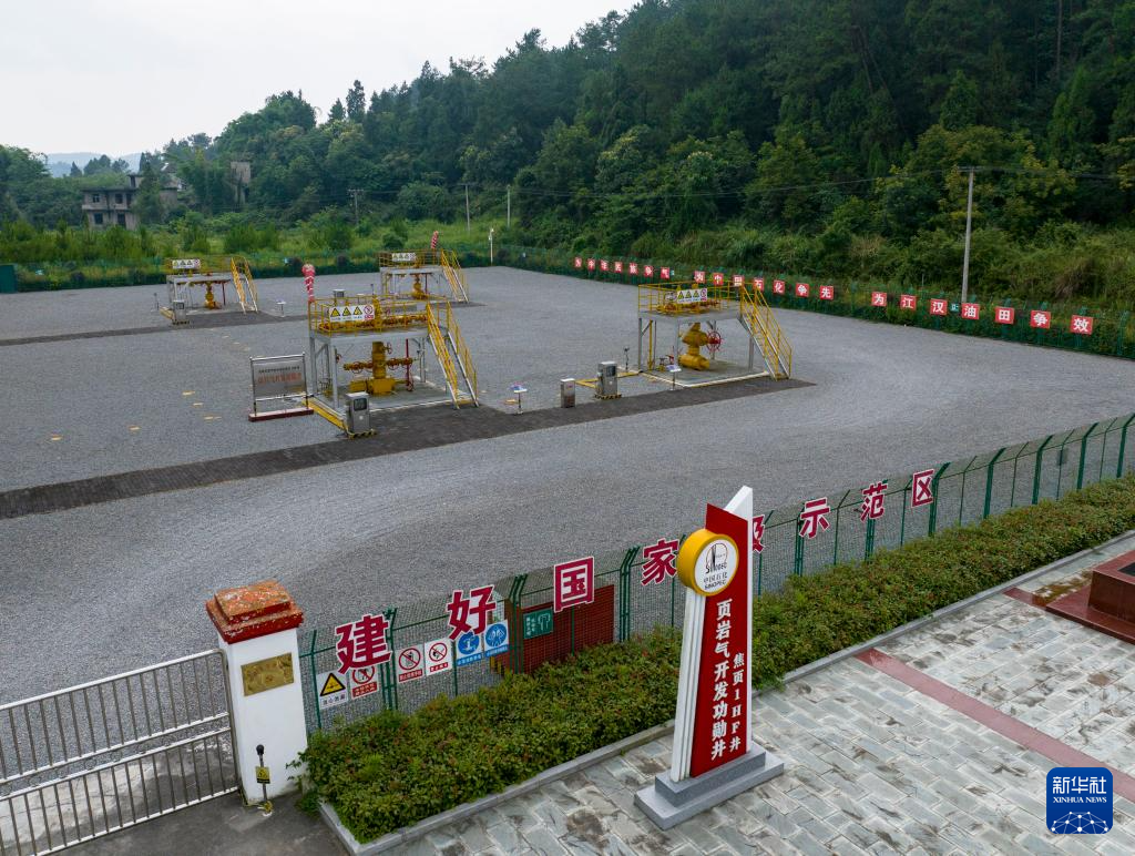 这是6月25日在重庆市涪陵区焦石坝区块拍摄的涪陵页岩气田焦页1HF井(无人机照片)。焦页1HF井是中国石化部署在涪陵焦石坝区块的第一口探井,于2012年11月28日放喷测试,截至2023年底焦页1HF井累产超过1.6亿立方米,被命名为“页岩气开发功勋井”。