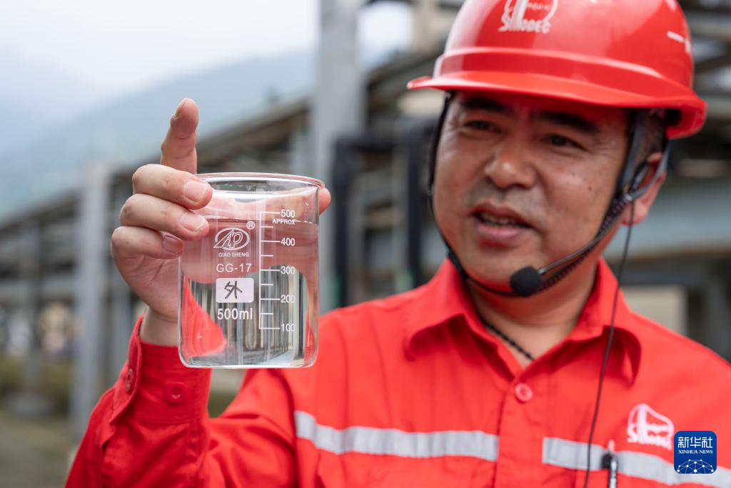 6月25日,在重庆市涪陵区白涛镇油坊村的涪陵页岩气田白涛产出水处理站,工作人员展示处理合格的产出水。