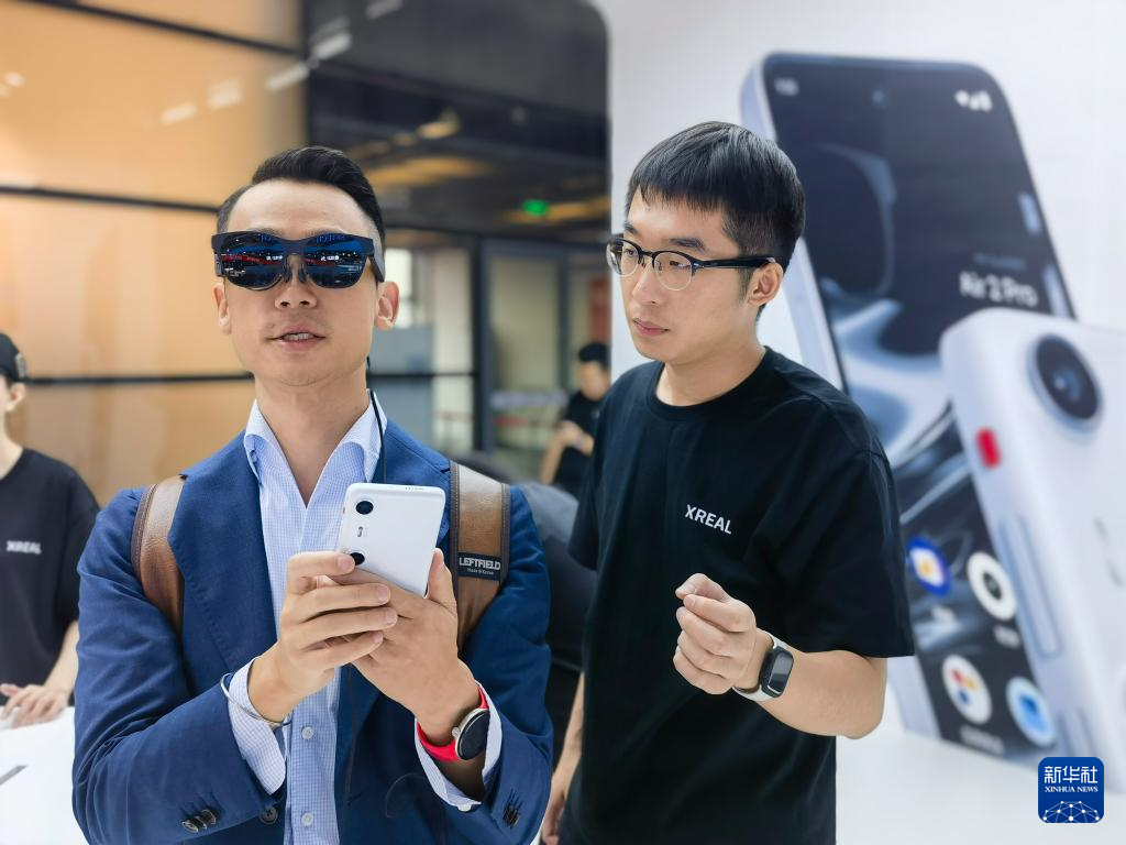 6月26日,在XREAL展台,观众(左)体验AR眼镜产品。