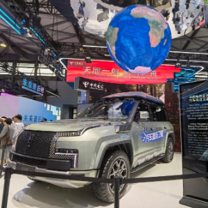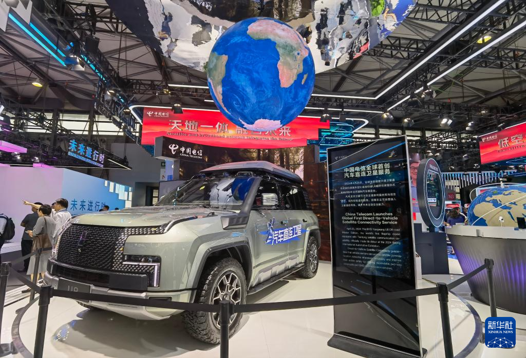 6月26日在中国电信展台拍摄的汽车直连卫星服务介绍。