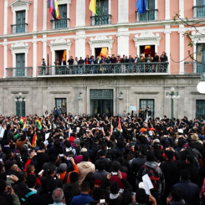 6月26日,在玻利维亚拉巴斯,士兵聚集在总统府附近的街道上。