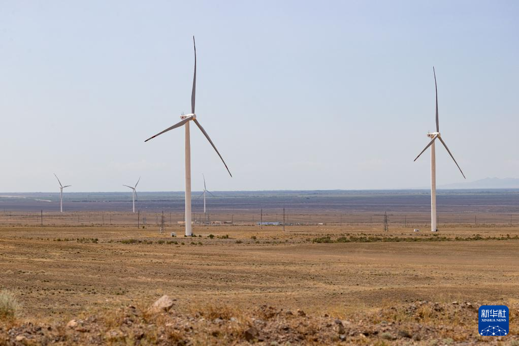 这是6月25日在哈萨克斯坦阿拉木图州谢列克风电场拍摄的风机和集电线路。