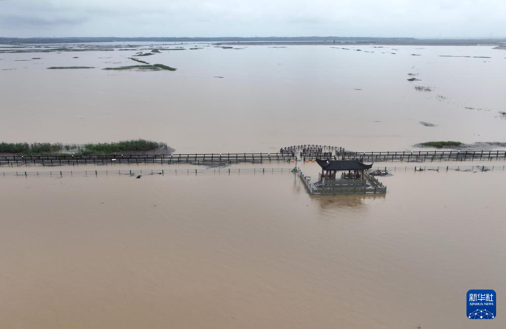 在江西省庐山市,亲水步道已被上涨的湖水淹没(6月27日摄,无人机照片)。