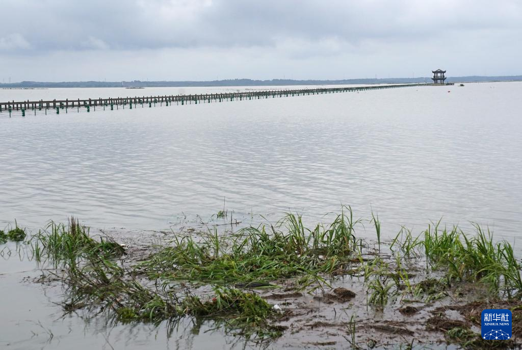 在江西省庐山市,亲水步道已被上涨的湖水淹没(6月27日摄)。