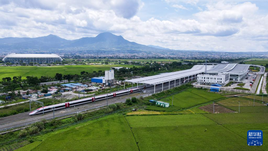 在印度尼西亚万隆德卡鲁尔站,一列雅万高铁高速动车组驶出站台(无人机照片,4月17日摄)。