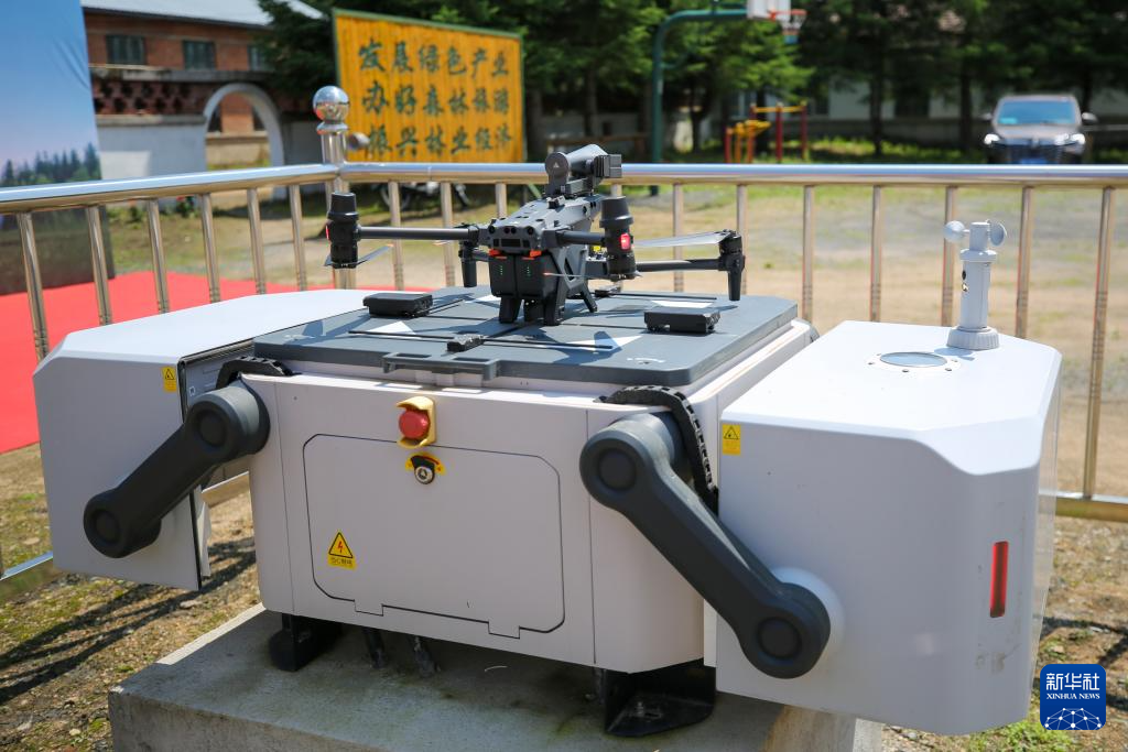 这是6月27日在伊春森工带岭林业局有限责任公司明月林场拍摄的森林智能巡护无人机与机场平台。