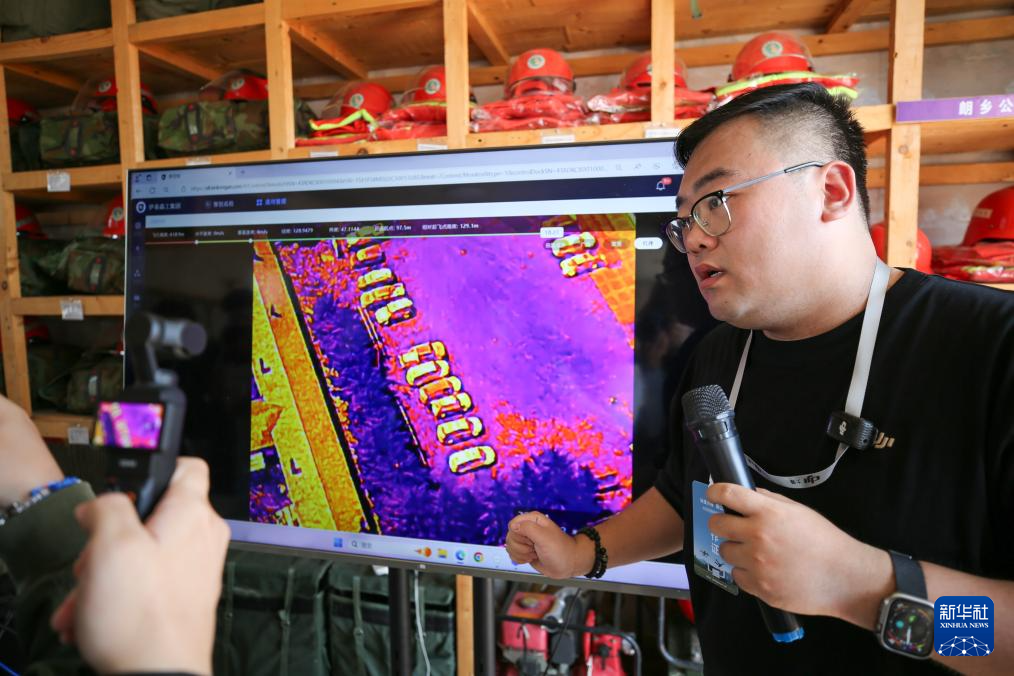 6月27日,在伊春森工带岭林业局有限责任公司明月林场,大疆工作人员向记者介绍无人机森林智能巡护热成像功能。