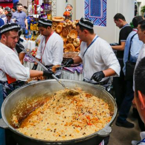 6月27日,在第八届中国—亚欧博览会上,乌兹别克斯坦展台工作人员制作特色食品。