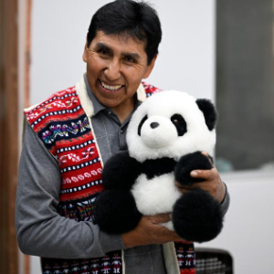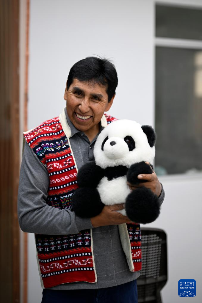6月20日,在秘鲁阿雷基帕,手工艺人奥斯瓦尔多·马马尼展示羊驼毛制作的熊猫玩偶。