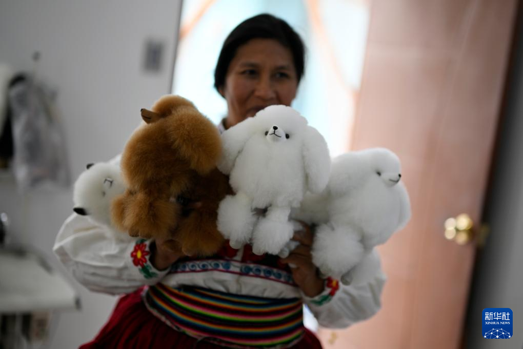 6月20日,在秘鲁阿雷基帕,马马尼与中方合作品牌的秘鲁合伙人亚历杭德拉·贝德雷加尔(右一)检查羊驼玩偶。